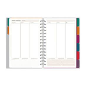 Capa dura, miolo com 210 páginas (105 folhas), formato: 13,4 cm x 20,5 cm, papel offset 90 g/m2 (a tinta das canetas não passa para o outro lado), encadernação em wire-o e elástico para fechamento. Acompanha envelope para documentos, marcador de páginas, capa plástica protetora, folhas de adesivos, 12 divisórias mensais. Conteúdo: calendário, dados pessoais, mais sobre mim, minhas metas, visão anual, ler/assistir/visitar, minhas viagens, cuide-se (bem-estar), visão mensal, inspirações para o mês, visão da semana, monitoramento de hábitos, minhas finanças e balanço do ano.