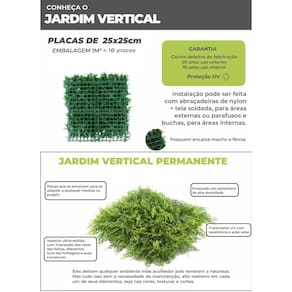 Possuem moldura ultra-flexível com conectores de intertravamento que facilitam a instalação - é só encaixar um painel no outro para montar lindos ambientes Os painéis verdes tem excelente durabilidade em ambientes externos por serem resistentes a variações climáticas. Também, não precisam de manutenção poda e irrigação .