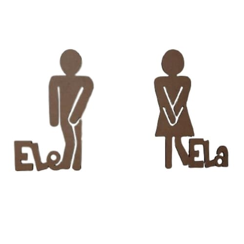 Palaca sinalização para banheiro, masculino e feminino, mdf 3mm cortado a laser, medindo 18 centimentros de altura por 14 centimetros de largura, acompanha fita dupla face, este anuncio em especifico é referente ao par com a cor natural, que pode ser pintada e personalizada de acordo com o gosto do cliente.