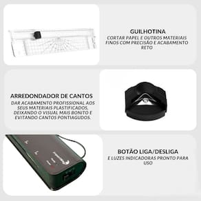 Itens inclusos: 1 Plastificadora, 1 Guilhotina, 1 Arredondador de Cantos, 1 Manual