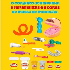 O KIT COMPLETO PARA DENTISTAS. O conjunto inclui 6 potes de massa de modelar Play-Doh (56 g), sendo 2 com efeito metálico, além de 10 ferramentas como escova que espreme pasta, espelho, pinça e fio dental para uma brincadeira imersiva.