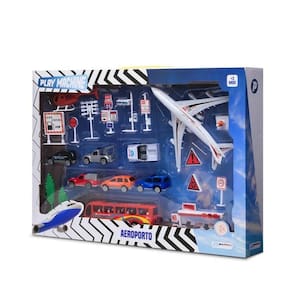 Conteúdo e Dimensões: Conteúdo: 1 avião, 6 carrinhos, 1 ônibus, 1 helicóptero, 1 mini posto e 11 acessórios decorativos, Dimensões do avião. (aprox.): 18cm comprimento. Dimensões da Embalagem aprox.(axlxp): 31 x 44 x 7 cm.
