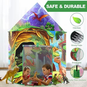 1 - ?Durável e inodoro? A barraca infantil é feita de alta qualidade, não tóxica, durabilidade e inodora. A barraca infantil é respirável porque há uma ampla porta de amarração e duas janelas de ventilação de malha na lateral da barraca de bebê para os pais monitorarem as crianças fora da barraca de brincar, as crianças ficarão confortáveis enquanto ficam dentro das barracas infantis. As barracas pop-up apresentam hastes de fibra de vidro que não dobram ou quebram e bolsos reforçados no teto e no chão, você não precisa se preocupar que a barraca de dinossauro caia ou machuque seus filhos. A barraca infantil é durável para suportar qualquer aventura de seus filhos. - ?Vamos para a barraca de dinossauro? Olha! Criamos um espaço com tema de dinossauro para o seu filho. O vulcão está em erupção, o céu está trovejando, o pterossauro está fugindo, o tiranossauro está gritando. Na barraca de brincar para meninos, um pterodáctilo está deitado na parte de trás do Tanystropheus; dois tricerátopos estão caminhando intimamente. Existem várias ilustrações de dinossauros na casa de rejeição de dinossauros como: tiranossauro, pterodáctilos, tanstrofeu, brontossauro, velociraptor, braquiossauro, estegossauro, alossauro, etossauro, plesiossauro e muito mais que ajudarão as crianças a reconhecer vários dinossauros. - ?Tamanho espaçoso o suficiente? A barraca pop-up de dinossauro tem 133 cm de altura x 101 cm de diâmetro, grande o suficiente para acomodar até três crianças e perfeita para encontros, leitura, armazenamento de brinquedos, brincar de brincar e muito mais, os pais também podem sentar dentro e brincar com seus filhos. Na barraca de brincar interna para crianças, você pode se aproximar do seu filho, quão macio e doce você conta uma história para dormir enquanto está deitado na barraca antes de dormir. - ?Fácil de montar e dobrar? As barracas de brinquedo infantis internas para meninos vêm com bolsa portátil e instruções (sem garantia de versão em português). Você pode seguir o passo das instruções para montar ou dobrar para armazenamento. Basta abrir, depois inserir os postes e prender com laços. A barraca para crianças em ambientes internos pode ser instalada em qualquer lugar, como parque, jardim, até mesmo em sua casa. Quando você não usar as barracas infantis em ambientes internos, elas podem ser dobradas e colocadas na bolsa de armazenamento, que pode ser colocada em qualquer lugar, pois não ocupa muito espaço. - ?Presente perfeito e inesquecível para seus filhos? Todo mundo precisa de um pouco de espaço só para si. Dê ao seu filho o forte para brincar ou dormir. Promove a diversão, o crescimento, a exploração e o aprendizado das crianças. Use barraca de dinossauro em festas, piqueniques, churrascos no quintal, parques, playgrounds, creches, escola, carnavais, festas do pijama ou apenas mantenha as barracas infantis para meninos no berçário como barraca de cama ou adicione aos seus brinquedos existentes para meninos e meninas de 3, 4, 5, 6, 7, 8 anos de idade ou mais. A barraca infantil é um presente especial para seus filhos em aniversários, Natal, Halloween, etc. Serve perfeitamente para qualquer festa infantil temática!