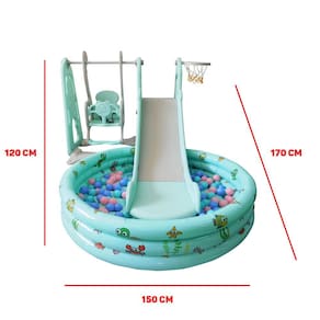 O conjunto conta com escorregador, balanço, acessório para arremesso e espaço lúdico para brincadeiras livres, oferecendo diferentes formas de interação em um único produto. Seu design foi pensado para uso recreativo simples, sem finalidade profissional ou coletiva.