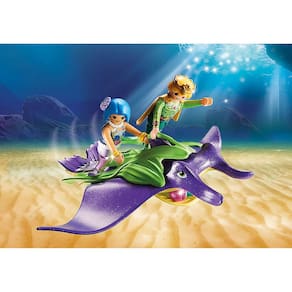 Os dois colecionadores de pérolas já estão procurando as preciosas contas de luz o dia todo. Somente através das contas luminosas a luz penetra na escuridão do mar. Lá nos corais estão dois espécimes particularmente brilhantes. Com cuidado a sereia pega a pérola com a concha e a coloca delicadamente na cesta de coleta. Até a noite, os dois têm que pesquisar mais. Felizmente, eles têm duas arraias fiéis como companhia. O playset contém duas figuras do mar Playmobil, duas raias de arraia, dois corais com contas, uma cesta de colecionador e outros extras. Figuras: 1 sereia, 1 tritão Animais: 1 raia com capa de algas, 1 raia bebê Acessórios: 1 rede coletora para contas, 1 folha de alga com cabo, 4 contas, 2 pulseiras, 1 flor de cabelo, 1 colar, 1 coroa, 1 capa , 2 plantas de coral