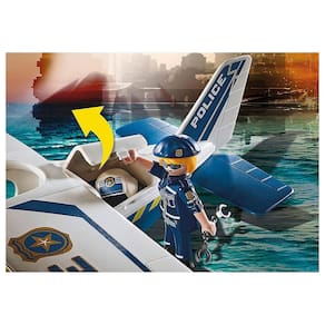 O hidroavião da polícia persegue o bote do contrabandista em uma emocionante perseguição na água. Com corda para ações espetaculares de rapel. A corajosa polícia da PLAYMOBIL também mantém a lei e a ordem no ar. Um bandido está fugindo com seus bens contrabandeados. Ele tenta escapar no bote de borracha. Mas o piloto esperto fica de olho nele o tempo todo da cabine e não o deixa escapar.