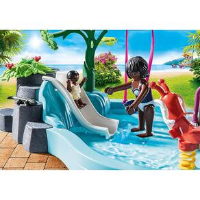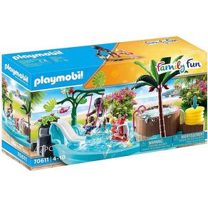 Descrição: Mergulhe no seu dia na piscina infantil. O bebê balança alegremente para cima e para baixo no balanço e chuta a água com os pés. Após a rodada de natação, a mãe testa o redemoinho, enquanto uma garotinha balança alegremente para frente e para trás.