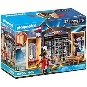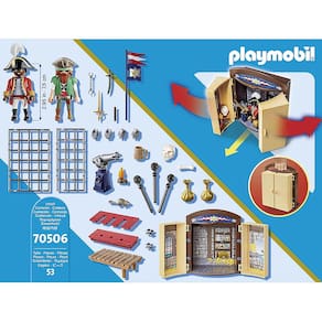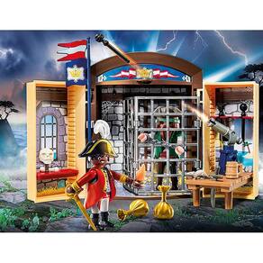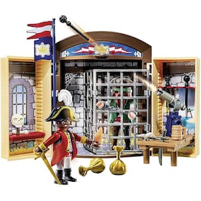 Descrição: Piratas e soldados travam uma amarga batalha pela supremacia nos mares há muitos anos. O bravo soldado da rocha vermelha acredita que seu precioso tesouro está seguro no bastião, mas um astuto pirata decide roubar o baú com o ouro. Felizmente, a pequena fortaleza está bem protegida com uma parede de grade destacável e um canhão com balas. O pirata ainda conseguirá roubar o tesouro?