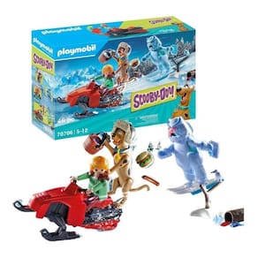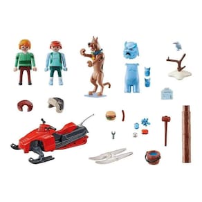 O conjunto inclui Scooby-Doo, Salsicha, Fantasma da neve, moto de neve, cartão fantasma e outros acessórios de inverno. Dimensões: 5,1 x 2,8 x 2,2 pol. (CxLxA) Recomendado para idades de cinco a doze anos. Aviso. Perigo de asfixia. Peças pequenas. Não para crianças menores de 3 anos. TOTAL DE 46PEÇAS