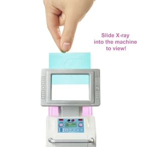 - A boneca médica Barbie pode se preparar em seu posto médico, fazer radiografias e verificar os pacientes na mesa de exames.