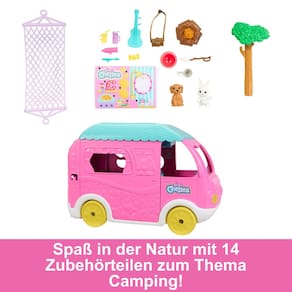 Barbie Camper, conjunto de brinquedos 2 em 1 Chelsea com boneca pequena, 2 animais de estimação e 15 acessórios, veículo se transforma em acampamento