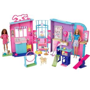 Conteudo - 01Inclui Barbie® Babá de Animais de Estimação; - 02 camas para animais de estimação; - 03 trelas; - 03 tigelas para animais de estimação e 8 acessórios adicionais; - 02 bonecas Barbie Fashion, cada uma com 1 vestido e 1 par de sapatos; - 04 cães; - 04 gatos; - 01 carro de brincar; - 01 pula-pula; - 01 gangorra;