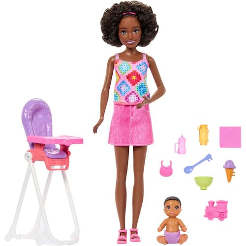 Playset Barbie Skipper Babás, Inc. com boneca morena, boneca bebê morena, cadeirinha alta e 8 acessórios, incluindo comida.