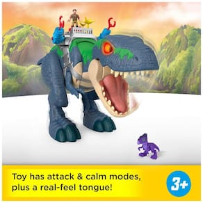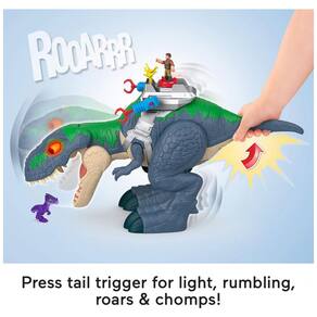 O playset Fisher-Price Imaginext Jurassic World Rebirth Ultimate Action Chomp T. rex apresenta um grande T. rex eletrônico com luzes, sons, movimentos e recursos de ação inspirados no filme Jurassic World Rebirth. O dinossauro mede aproximadamente 45,7 cm de altura e 76,2 cm de comprimento, oferecendo presença de destaque em brincadeiras de chão e cenários de aventura.?