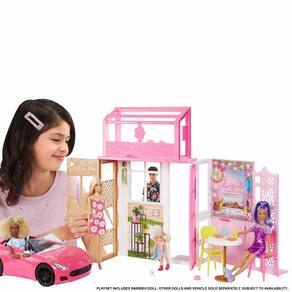 As crianças estão convidadas a brincar com esta casa de bonecas Barbie com uma brincadeira em 360 graus, duas histórias, quatro áreas de brincadeira e muitas histórias para contar! Esta casa Barbie totalmente mobiliada apresenta um design moderno com o estilo exclusivo da Barbie e tudo que as crianças precisam para contar suas histórias, incluindo a boneca Barbie e seu adorável cachorrinho de estimação! Dê as boas-vindas aos amigos na porta da frente, prepare-se para se divertir na cozinha e sirva na mesa de jantar com capacidade para dois. Depois de um dia de brincadeiras, as crianças podem colocar a boneca Barbie na cama alta para uma noite confortável de sono. Móveis e acessórios divertidos inspiram histórias intermináveis e, quando a hora das brincadeiras acaba, todo o conjunto se dobra para uma fácil limpeza e armazenagem.