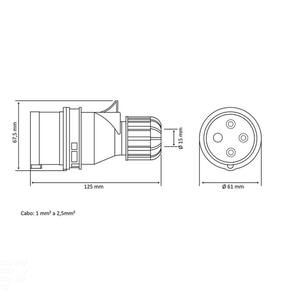 O Plugue Móvel Industrial 3P+T 16 A 220-250 Vca 9 H Tramontina é a escolha certa para as instalações elétricas de pavilhões e indústrias. Ele possui confecção em termoplástico auto extinguível, material isolante e de alta resistência mecânica. Ele é muito fácil de instalar, pois conta com sistema de desmontagem simples: você só precisa liberar a trava com o auxílio de uma chave de fenda e girar para desmontar. E o melhor, o presa-cabo integrado é muito fácil de ajustar e dispensa o uso de ferramentas, o que garante melhor fixação do cabo e vedação. Os melhores produtos para seus projetos, você só encontra com Tramontina! Orientações Atende a norma IEC 60309.Intercambiável com outros produtos desenvolvidos em conformidade com a norma IEC 60309. Possui grau de proteção IP44.Temperatura de utilização -25 °C a 40 °C. Características Gerais EAN13 7891435942651 DUN14 17891435942658 NCM 8536.69.10 Peso Líquido 0,1330 kg. Peso Bruto 0,1430 kg. Metragem 0,000300 m³. Dimensões Embalagem (Compr. X Larg. X Alt.) 130x 48x 48 mm. Dimensões Produto (Compr. X Larg. X Alt.) 130x 48x 48 mm. Observações É importante que seja instalado por profissional habilitado. Antes de instalar, desligue a energia elétrica.