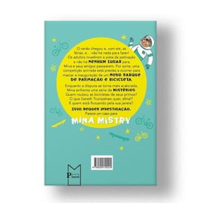 O terceiro livro da série "Mina Mistry (meio que) investiga", contado em forma de diário e repleto de ilustrações! As histórias acompanham uma menina que gosta muito de investigar os mistérios que acontecem ao seu Redor. O verão chegou e, com ele, as férias, e… não há nada para fazer! Os adultos invadiram a pista de patinação e não há NENHUM LUGAR para Mina e seus amigos passearem. Por sorte, uma competição acirrada está prestes a ocorrer para marcar a inauguração de um NOVO PARQUE PARA VELOCISTAS. Enquanto a disputa se torna mais acalorada, Mina enfrenta uma série de MISTÉRIOS. Quem roubou as bicicletas de seus primos? O que Gareth Trumpshaw quer, afinal? E quem está flutuando pela sua janela? ISSO REQUER INVESTIGAÇÃO. Parece um caso para MINA MISTRY.