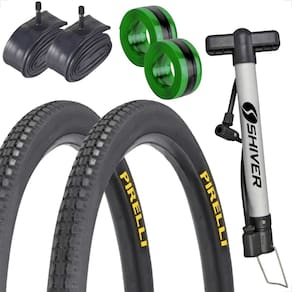 2 unidades Pneus Pirelli Primor aro 2626X1.1/2X2 2 unidades Camera de ar 26 Shiver 2 unidades fita antifuro Tectire 1 unidade bomba de ar manual Shiver