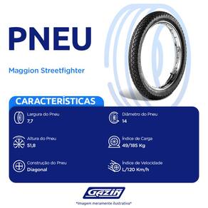 Tenha um excelente desempenho dentro da cidade com o Maggion Streetfighter! Ele além de ser um pneu de alta resistência ainda vai proporcionar ao usuário todo conforto que um pneu pode oferecer em uma viagem seja para o trabalho ou para um dia de passeio. Confira mais detalhes: O Streetfighter é um pneu com uma excelente versatilidade, se encaixa em diferentes tipos de motocicletas por ter um desenho e tamanho padrão, basta saber as medidas do aro de sua moto. Sua construção diagonal além de garantir uma maior estabilidade a motocicleta, ele também proporciona uma super resistência na sua lateral por ser um pneu mais rígido comparado aos demais.