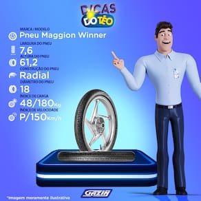 O Pneu Dianteiro Maggion Winner, possui aro 18, e se encaixa perfeitamente em motos Cg, Fan, Factor, Titan e modelos similares. Voce pode trabalhar, passear, viajar com maxima seguranca. Os pneus diagonais sao muito mais resistentes ao desgaste diario e suporte de peso. Assim, mesmo que a moto trafegue por locais asperos e dificeis, a medida certa entre estabilidade ao motorista e conservacao do pneu sob as melhores condicoes esta aqui! O Winner suporta ate 180 kg e conta com indice de velocidade 48.