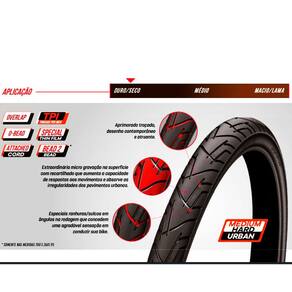 Um pneu preciso, absoluto para uso urbano. Agilidade e leveza, excelente aderência ao solo, elevada durabilidade. Apresenta um desenho que aprimora a sensação direcional, com inigualável qualidade de mobilidade. Acentuada sensação de conforto e confiança em sua bike.