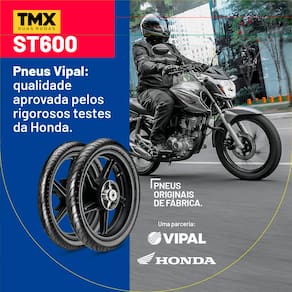O Vipal ST600 tubeless, uma linha inovadora de pneus sem câmara, com a Tecnologia Vipal de Profundidade Variável (PV), que possui sulcos menos profundos nas laterais do pneu e mais profundos na região central, onde há um maior desgaste, trazendo um novo patamar de desempenho para motos de baixa cilindrada.