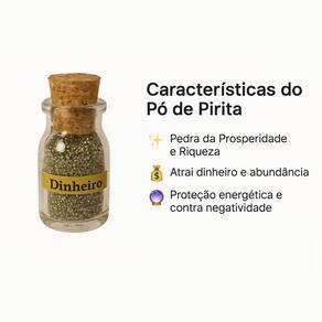 O Pó de Pedra Pirita Natural Ouro é um poderoso amuleto energético Conhecida como a “Pedra da Fortuna”, a pirita é associada à energia do sucesso, riqueza e crescimento material. Características do Produto - Produto: Pó de Pedra Pirita Natural Ouro - Origem: Natural - Energia: Prosperidade, sucesso e abundância - Uso recomendado: Amuletos, rituais, energizações e proteção Dica energética: Coloque um pouco do pó de pirita na carteira, no caixa da sua empresa ou no seu altar para atrair boas energias financeiras.
