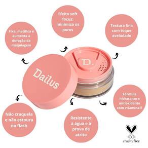 - fixa, matifica e aumenta a duração da maquiagem. - efeito soft focus: minimiza os poros. - textura fina com toque aveludado. - fórmula hidratante e antioxidante com vitamina e. - resistente à água. - à prova de atrito. - não estoura no flash. - não craquela. - hipoalergênico. - testado dermatologicamente. - livre de parabenos. - vegano e cruelty-free.