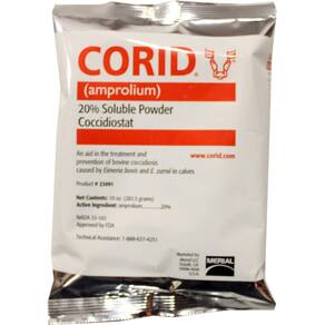 Huvepharma Corid 20% em pó solúvel para bezerros. Trate seu rebanho com pó solúvel de Corid 20% (amprolium). Este pó de amprólio é um auxiliar no tratamento e prevenção da coccidiose bovina causada por Eimeria bovis e Eimeria zurnii em bezerros. Use este tratamento de coccidiose bovina conforme as instruções. Tratamento: misture 10 onças com 125 galões de água e ofereça como única fonte de água por 5 dias. Prevenção: misture 10 onças com 250 galões de água e ofereça como única fonte de água por 21 dias. O tratamento deve ser feito apenas por rebanho; quando um ou mais bezerros apresentam sinais de coccidiose, é provável que o resto do grupo tenha sido exposto e todos os bezerros do grupo devam ser tratados.