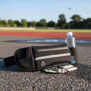 Pochete fitness slim impermeável, compacta e leve, com bolso principal espaçoso para celular até 10cm de largura e mais dois bolsos laterais independentes. Possui alça elástica ajustável até 120cm, faixa refletiva para segurança noturna e saída emborrachada para fones de ouvido. Feita em tecido neoprene com fechamento em zíper.