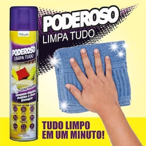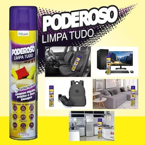 Poderoso Limpa Tudo Indicação: Espuma poderosa desenvolvida para a limpeza automotiva e doméstica em locais como partes internas do veículo, sofás, cortinas, carpetes, tecidos em geral, computadores, fórmicas, vinil, plástico, borrachas, tênis, sapatos, sandálias, bolsas, mochilas e couro. Modo de usar: Agite a embalagem e aplique o produto de maneira uniforme. A uma distância de aproximadamente 20 centímetros da superfície a ser limpa. Deixe o produto agir por 1 minuto. Esfregue se necessário. Retire o excesso e seque com um pano seco. Observação: Em tecidos ou outras superfícies a serem limpas que apresentem cor forte, fazer um teste de compatibilidade, pois poderá desbotar ou manchar. Observação: Em tecidos ou outras superfícies que apresentem cor forte, fazer um teste de compatibilidade, pois poderá desbotar ou manchar. Conteúdo: 1 embalagem de 300 ml