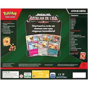 POKÉMON 3 Charizard ex, 3 Charmeleon, 4 Charmander, 2 Pidgeot ex, 2 Pidgeotto, 3 Pidgey, 3 Moltres CARTAS DE TREINADOR 4 Kissera, 2 Arven, 2 Ordem da Chefia (Ghetsis), 2 Pesquisa de Professores (Profª Arka), 2 Artazon, 4 Poffin de Colega, 4 Doce Raro, 4 Ultra Bola, 1 Pegador Superior, 1 Supervara, 1 Substituição, 2 Máquina Técnica: Evolução, 1 Faixa de Desafio CARTAS DE ENERGIA 10 Energia de fogo Básica