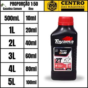 Operador, instrução de mistura recomendada para a utilização da máquina com o Óleo 2T TOYAMA LUB (1:50) 500ml : Observe sempre a proporção da mistura específica deste óleo, onde para cada 1 Litro de Gasolina utilizar 20ml do Óleo TOYAMA, ou para cada 500ml de Gasolina utilizar 10ml do Óleo TOYAMA. Além de manter o bom funcionamento, você pode prevenir futuras falhas e excesso de fumaça no cilindro de combustão.