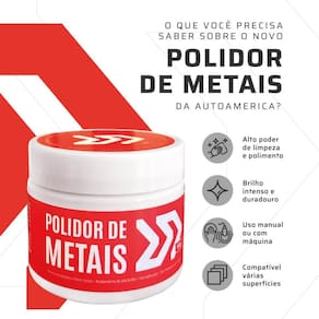 Polidor de Metais 150g Autoamerica O brilho que você sempre quis agora tem nome: Polidor de Metais Autoamerica. Especialmente formulado para proporcionar um acabamento perfeito, ele remove com facilidade oxidações, micro-riscos, manchas e outras imperfeições que comprometem o visual das superfícies metálicas. Sua consistência cremosa facilita a aplicação e garante uma limpeza profunda com acabamento refinado, mesmo nas áreas mais delicadas. Benefícios do Produto: Restauração completa: Remove oxidações, micro-riscos e marcas de uso. Alto rendimento: Embalagem de 150g ideal para várias aplicações. Proteção prolongada: Forma uma camada protetora contra novas agressões. Fácil de aplicar: Textura cremosa e homogênea, com ótimo espalhamento. Seja para revitalizar detalhes cromados do seu carro, dar nova vida a metais envelhecidos ou proteger superfícies expostas, o Polidor de Metais Autoamerica entrega resultados visíveis desde a primeira aplicação. Dê brilho, destaque e proteção aos metais com quem entende do assunto A NR Estética oferece uma de 7 dias em seus produtos