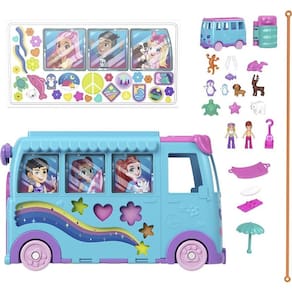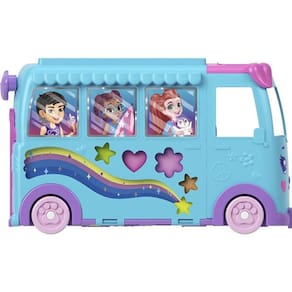 Inclui 1 conjunto de brinquedo de van transformadora, 2 micro bonecas e 21 acessorios, incluindo animais de estimacao e um veiculo de micro van.