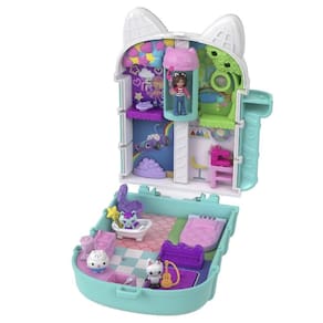 É um dia perfeito para brincar! O Polly Pocket Estojo Gabby's Dollhouse e a Polly Pocket se juntam para criar o conjunto de brinquedos de festa perfeito, ideal para crianças que amam aventuras e surpresas. O Polly Pocket Estojo Gabby's Dollhouse, fabricado pela renomada marca Mattel, é um estojo compacto adorável no formato da Gabby's Dollhouse, com um divertido agitador de purpurina no teto. Gabby e seus três amigos gatinhos estão prontos para se divertir! No interior, explore recursos interativos como um elevador para gatos que desliza para visitar cada cômodo, uma faixa que se desenrola no salão de festas, uma penteadeira e uma cama que se abre para revelar surpresas.