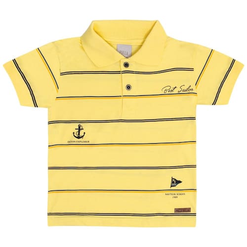 Com toque suave e fresquinho para uso diário ou ocasiões especiais, a camiseta polo na cor sol possuí mangas curtas, listras e fechamento de gola por botões, etiqueta termocolante e bordado pequeno de âncora com escrita "Escola náutica 1989, explorador do oceano, melhor marinheiro".