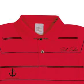 Com toque suave e fresquinho para uso diário ou ocasiões especiais, a camiseta polo na cor vermelha possuí mangas curtas, listras e fechamento de gola por botões, etiqueta termocolante e bordado pequeno de âncora com escrita "Escola náutica 1989, explorador do oceano, melhor marinheiro".