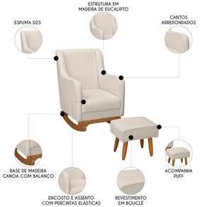 Com estrutura em madeira de eucalipto, oferece resistência e durabilidade no uso diário. A espuma D-23 combinada com o tecido bouclê da Poltrona proporciona um toque macio e agradável, excelente para longas períodos de amamentação. Seus pés de madeira contam com suporte estável e acabamento sofisticado, enquanto o mecanismo de balanço suaviza os movimentos, sendo perfeito para ninar o neném, promovendo relaxamento e bem-estar. O assento e o encosto são sustentados por percintas elásticas, garantindo firmeza e apoio adequados. O Puff incluso é ótimo para descansar os pés e aumentar ainda mais o conforto. Perfeita para quem busca praticidade e estilo, essa Poltrona de Amamentação se adapta facilmente a qualquer ambiente, seja no Quarto de bebê, na Sala de Estar ou em outros espaços, trazendo elegância e aconchego.
