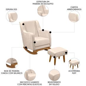 Com estrutura em madeira de eucalipto, oferece resistência e durabilidade no uso diário. A espuma D-23 combinada com o tecido veludo da Poltrona proporciona um toque macio e agradável, excelente para longas períodos de amamentação. Seus pés de madeira contam com suporte estável e acabamento sofisticado, enquanto o mecanismo de balanço suaviza os movimentos, sendo perfeito para ninar o neném, promovendo relaxamento e bem-estar. O assento e o encosto são sustentados por percintas elásticas, garantindo firmeza e apoio adequados. O Puff incluso é ótimo para descansar os pés e aumentar ainda mais o conforto. Perfeita para quem busca praticidade e estilo, essa Poltrona de Amamentação se adapta facilmente a qualquer ambiente, seja no Quarto de bebê, na Sala de Estar ou em outros espaços, trazendo elegância e aconchego.