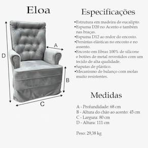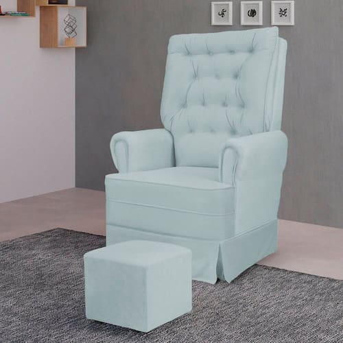 As imagens são meramente ilustrativas, não serão enviados objetos de decoração, eletrônicos e demais itens que não estejam especificados nos itens inclusos. Acompanha Almofadas extras: Não Acompanha Puff: Sim Almofada do assento: Não Possui Almofada do encosto: Fixa Altura do assento até o chão: 45 cm Altura do Encosto: 71 cm Ambiente Principal: Quarto Infantil Cor: Sereno Cor do Produto: Sereno Design Assinado: Não Enchimento do Braço: Espuma D-23 Enchimento do Encosto: Fibra Siliconada Encosto para a Cabeça: Não Estampado: Não Extensível: Não Itens Inclusos: 1 Poltrona amamentação e 1 puff Linha ou Coleção: Eloa Material do Braço: Madeira revestida de espuma e tecido Modelo de Poltrona: Balanço Necessita Montagem: Não Origem do Produto: Nacional Peso: 28 kg Possui Percintas Elásticas: Sim Possui Pés: Não Recomendações de Uso, Manutenção e Limpeza: Limpar com um pano levemente umidecido Suporta Até (kg): 100 kg Tecido Predominante: Boucle Tipo de Assento: Fixo Tipo de Encosto: Fixo Tipo de Espuma do Encosto: Fibra Siliconada Tipo de Poltrona: Amamentação