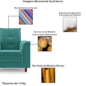 Estrutura: Em Madeira de EucaliptoEncosto da poltrona: Enchimento 100% em Fibra SiliconadaPuff: Enchimento 100% em Fibra SiliconadaAssento da poltrona: Espuma D-23Conteúdo da Embalagem:1 Poltrona e 1 Puff.Material dos Pés: Em madeiraRevestimento: SuedePeso Suportado: 110 kg