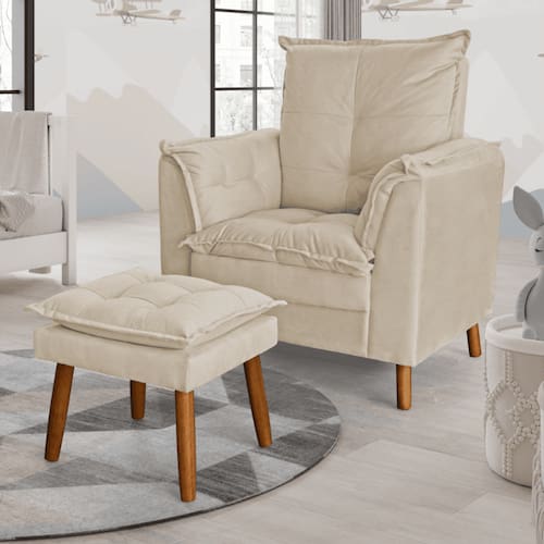 A Poltrona de Amamentação pés palito e Puff é um móvel essencial para deixar o quarto do seu bebê lindo e aconchegante. Produzida com madeira de pinus/eucalipto reflorestada com imunização contra mofo, cupim e microrganismos, tudo isso para manter a integridade da saúde do bebê, além disso conta com travamento da estrutura com grampos em aço galvanizado. Com a Poltrona Ariel aquele momento especial de amamentar ou fazer seu bebê dormir será ainda mais confortável. EspecificaçõesDimensões do ProdutoLargura: 90 cm.Altura: 100 cm.Profundidade: 68 cm.Peso: 20 Kg.Outras MedidasLargura do Assento: 45 cm.Altura até o Assento: 45 cm.Altura do Encosto: 58 cm.Profundidade do Assento: 42 cm.Importante: Por se tratar de estofado as medidas podem ter uma pequena variação.Dimensões do Puff (L x A x P): 40 x 42 x 45 cm.Características do Produto Material da Estrutura: Pinus e eucalipto de reflorestamento.Material de Enchimento: FibraRevestimento: Suede Peso Suportado: Até 120 Kg.Tipo de Encosto: Fixo.Tipo de Assento: Fixo. Entrega e Montagem: