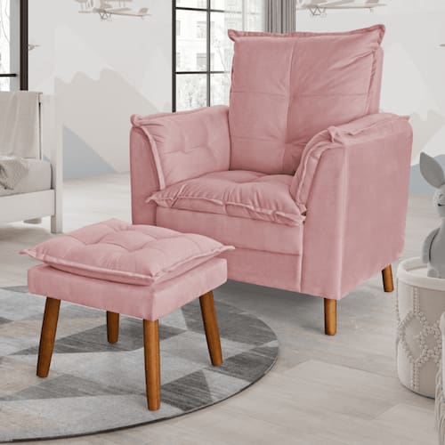 A Poltrona de Amamentação pés palito e Puff é um móvel essencial para deixar o quarto do seu bebê lindo e aconchegante. Produzida com madeira de pinus/eucalipto reflorestada com imunização contra mofo, cupim e microrganismos, tudo isso para manter a integridade da saúde do bebê, além disso conta com travamento da estrutura com grampos em aço galvanizado. Com a Poltrona Ariel aquele momento especial de amamentar ou fazer seu bebê dormir será ainda mais confortável. EspecificaçõesDimensões do ProdutoLargura: 90 cm.Altura: 100 cm.Profundidade: 68 cm.Peso: 20 Kg.Outras MedidasLargura do Assento: 45 cm.Altura até o Assento: 45 cm.Altura do Encosto: 58 cm.Profundidade do Assento: 42 cm.Importante: Por se tratar de estofado as medidas podem ter uma pequena variação.Dimensões do Puff (L x A x P): 40 x 42 x 45 cm.Características do Produto Material da Estrutura: Pinus e eucalipto de reflorestamento.Material de Enchimento: FibraRevestimento: Veludo Peso Suportado: Até 120 Kg.Tipo de Encosto: Fixo.Tipo de Assento: Fixo. Entrega e Montagem:
