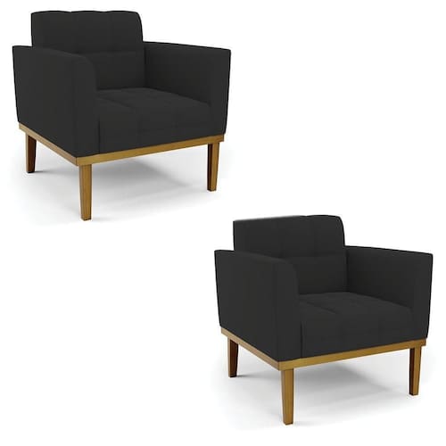 Você gosta de colecionar vários momentos memoráveis com sua família e amigos? Que tal recebê-los, com móveis de altíssima qualidade que só a D'Rossi tem? A Poltrona Elisa é adequada para você! Seu design retrô é a grande tendência do momento. Pode ser utilizada em diversos espaços da casa, em salas, hall de entrada, quartos, cozinhas, varanda, sacada, escritório, dentre outros. Contém as seguintes características: A estrutura é feita de madeira de Eucalipto 100% de reflorestamento, e a Base de Madeira Fixa Castanho, além de ser resistente e durável, suporta em média até 120 kg. Assento, encosto e braços, contém enchimento de espuma D-23 e é estofada em tecido Veludo, no tom Preto, que oferece muito conforto e resistência ao sentar, com aquela sensação de maciez e aconchego. Possui também, detalhes de costura no encosto e assento, resultando em um acabamento impecável, conferindo muito mais valor e elegância ao seu espaço. Para complementar a decoração com essa linda poltrona, a dica é utilizar mantas, almofadas ou vasinho de flor. E pronto, seu cantinho estará perfeito para descansar e relaxar! Aqui, você encontra várias opções, para que seus amigos e familiares se sintam acolhidos. Garanta já seu Kit 2 Poltronas..