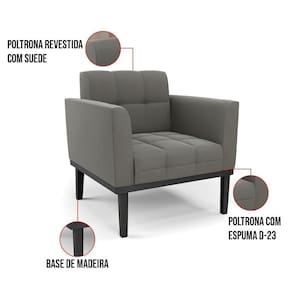 Você gosta de colecionar vários momentos memoráveis com sua família e amigos? Que tal recebê-los, com móveis de altíssima qualidade que só a D'Rossi tem? A Poltrona Elisa é adequada para você! Seu design retrô é a grande tendência do momento. Pode ser usada em diversos espaços da casa, em salas, hall de entrada, quartos, cozinhas, varanda, sacada, escritório, dentre outros. Contém as seguintes características: A estrutura é feita de madeira de Eucalipto 100% de reflorestamento, e a Base de Madeira Fixa Preto, além de ser resistente e durável, suporta em média até 120 kg. Assento, encosto e braços, contém enchimento de espuma D-23 e é estofada em tecido Suede no tom Grafite, que oferece muito conforto e resistência ao sentar, com aquela sensação de maciez e aconchego. Possui também, detalhes de costura no encosto e assento, resultando em um acabamento impecável, conferindo muito mais valor e elegância ao seu espaço. Para complementar a decoração com essa linda poltrona, a dica é utilizar mantas, almofadas ou vasinho de flor. E pronto, seu cantinho estará perfeito para descansar e relaxar! Aqui, você encontra várias opções, para que seus amigos e familiares se sintam acolhidos. Garanta já sua Poltrona.