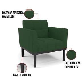 Você gosta de colecionar vários momentos memoráveis com sua família e amigos? Que tal recebê-los, com móveis de altíssima qualidade que só a D'Rossi tem? A Poltrona Elisa é adequada para você! Seu design retrô é a grande tendência do momento. Pode ser usada em diversos espaços da casa, em salas, hall de entrada, quartos, cozinhas, varanda, sacada, escritório, dentre outros. Contém as seguintes características: A estrutura é feita de madeira de Eucalipto 100% de reflorestamento, e a Base de Madeira Fixa Preto, além de ser resistente e durável, suporta em média até 120 kg. Assento, encosto e braços, contém enchimento de espuma D-23 e é estofada em tecido Veludo, no tom Verde, que oferece muito conforto e resistência ao sentar, com aquela sensação de maciez e aconchego. Possui também, detalhes de costura no encosto e assento, resultando em um acabamento impecável, conferindo muito mais valor e elegância ao seu espaço. Para complementar a decoração com essa linda poltrona, a dica é utilizar mantas, almofadas ou vasinho de flor. E pronto, seu cantinho estará perfeito para descansar e relaxar! Aqui, você encontra várias opções, para que seus amigos e familiares se sintam acolhidos. Garanta já seu Kit 2 Poltronas..
