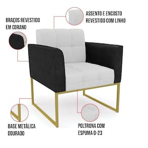 Você gosta de colecionar vários momentos memoráveis com sua família e amigos? Que tal recebê-los, com móveis de altíssima qualidade que só a D'Rossi tem? A Poltrona Elisa é adequada para você! Seu design retrô é a grande tendência do momento. Pode ser usada em diversos espaços da casa, em salas, hall de entrada, quartos, cozinhas, varanda, sacada, escritório, dentre outros. Contém as seguintes características: A estrutura é feita de madeira de Eucalipto 100% de reflorestamento, e a Base Industrial Dourado, além de ser resistente e durável, suporta em média até 120 kg. Assento, encosto e braços, contém enchimento de espuma D-23 e é estofada em tecido Corano Preto com Linho, no tom Cinza, que oferece muito conforto e resistência ao sentar, com aquela sensação de maciez e aconchego. Possui também, detalhes de costura no encosto e assento, resultando em um acabamento impecável, conferindo muito mais valor e elegância ao seu espaço. Para complementar a decoração com essa linda poltrona, a dica é utilizar mantas, almofadas ou vasinho de flor. E pronto, seu cantinho estará perfeito para descansar e relaxar! Aqui, você encontra várias opções, para que seus amigos e familiares se sintam acolhidos. Garanta já sua Poltrona.