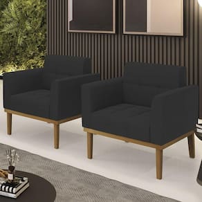 A Poltrona Decorativa é revestida em Veludo, que é durável e fácil de limpar, e ainda valoriza o design da poltrona. Os braços e encosto são confortáveis em espuma D-18, já o assento é com espuma D-26 de alta densidade, que garante um assento firme e aconchegante, ideal para relaxar após um dia cansativo. A base em madeira de eucalipto é um charme à parte, que confere um toque Rústico e sofisticado à peça. São 2 poltronas com estrutura resistente que suporta até 120 kg cada. A montagem é muito simples, pois a poltrona já vem pronta, bastando apenas fixar a base com os parafusos que acompanham o produto. A limpeza também é muito prática, pois basta utilizar um pano limpo e levemente úmido, sem produtos abrasivos, para manter a sua poltrona sempre em bom estado. Sem dúvidas a Poltrona Para Sala vai transformar seu ambiente, deixando mais confortável e estiloso!