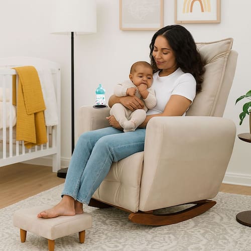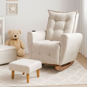 Poltrona Cadeira de Amamentação Balanço e Puff Ternura A poltrona amamentação proporciona todo o conforto e aconchego que a família precisa nesta fase tão especial, e encanta pelo seu estilo sofisticado. Feita com matéria-prima de alta qualidade a poltrona possui estofado revestido por tecido de toque suave que proporciona aconchego para os momentos de amamentação. O puff quadrado traz conforto e beleza para a rotina da mamãe, e ajuda no descanso para pernas e pés tornando o momento ainda mais confortável. A poltrona possui um balanço suave em sua base, e um encosto alto com espuma de excelente densidade e estrutura sólida de madeira.